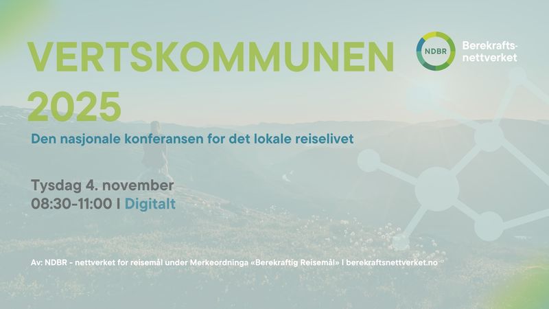Meld deg på her: Vertskommunen 2025 – 4. nov. 2025 – Nettverk for Destinasjonsutvikling og Bærekraftig Reisemålsutvikling. Del gjerne videre med kolleger og andre som er engasjert i bærekraftig reiselivsutvikling!